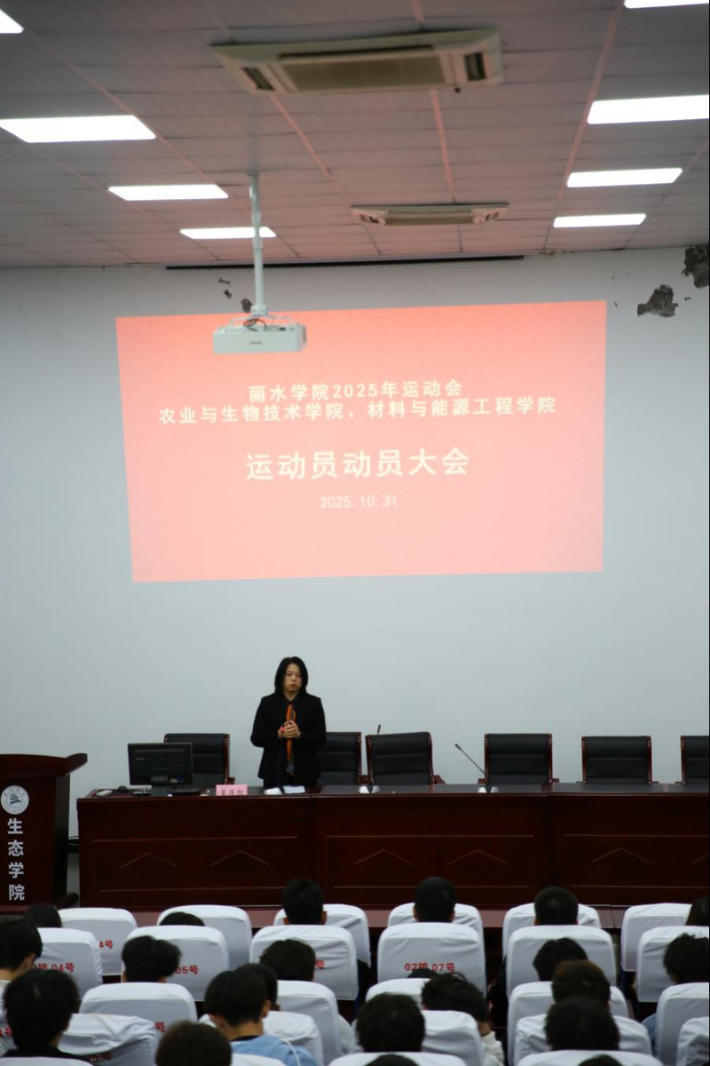 为积极备战丽水学院第四十八届运动会,激发全体运动员的参赛热情,农业与生物技术学院、材料与能源工程学院于2025年11月2日中午12:30在二号阶梯教室隆重举行运动员动员大会。本次大会由农业与生物技术学院党委副书记吴庆红、材料与能源工程学院辅导员杨子贤主持,与会人员包括农业与生物技术学院、材料与能源工程学院学生科全体辅导员、主席团成员、体育部全体成员、2025级各班班长和体育委员。